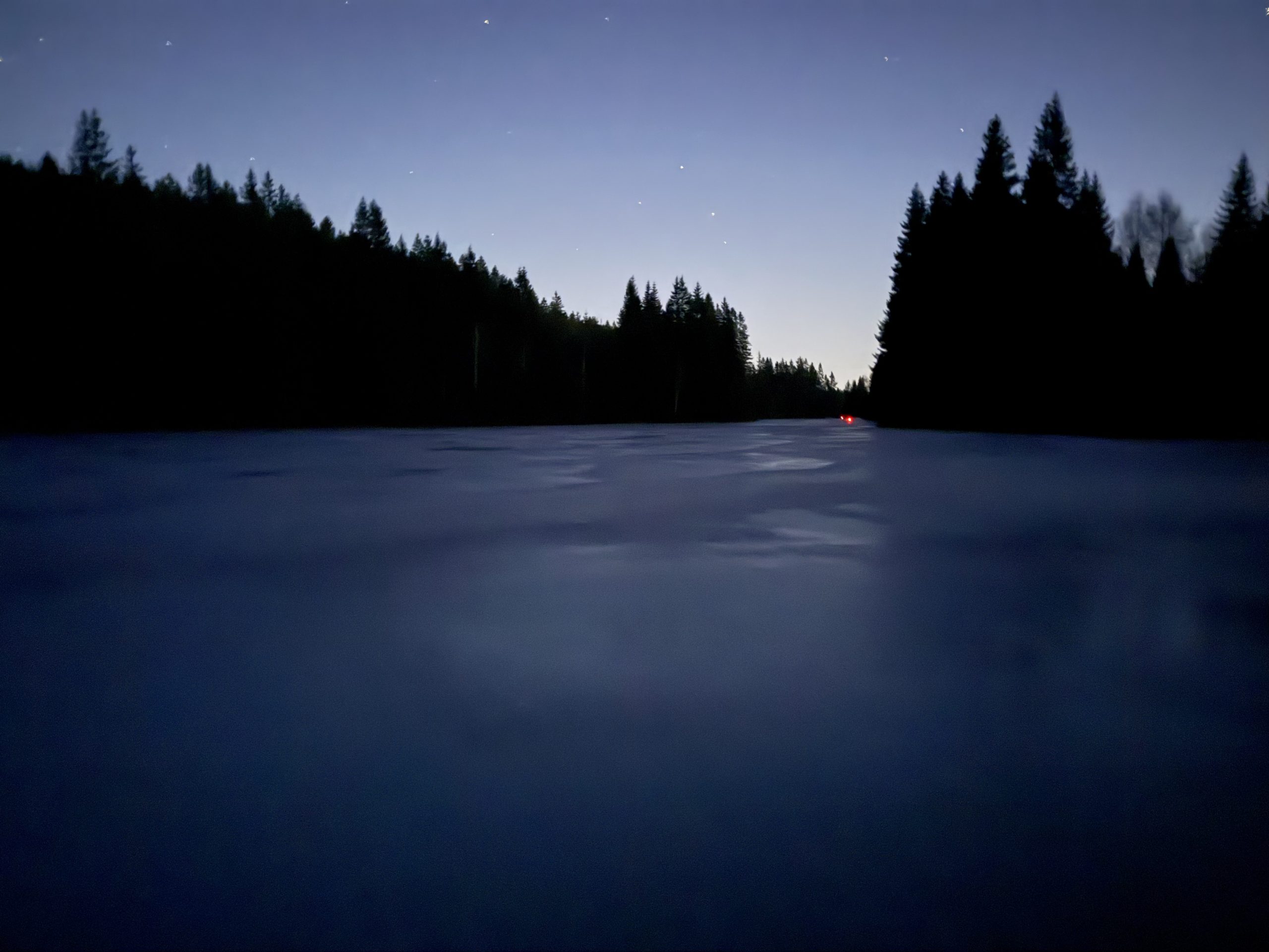 Proč si nesvítit čelovkou? Dvě zásadní proti. S čelovkou se bruslí v kuželu světla, nic dalšího není vidět, nuda. Žádné obrysy okolní krajiny, žádné hvězdy, ani pohled na temně tajemný led.